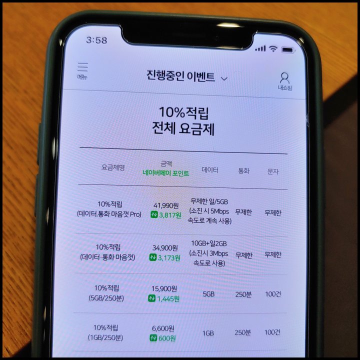 요금제 안내 요금제 안내 요금제 금액 데이터 통화 문자 N Pay 적립포인트 네이버쇼핑 할 때 사용할 수 있는네이버페이포인트 3,817원 매월적립 10%적립 (데이터·통화 마음껏 Pro) 41,990 38,173 (포인트