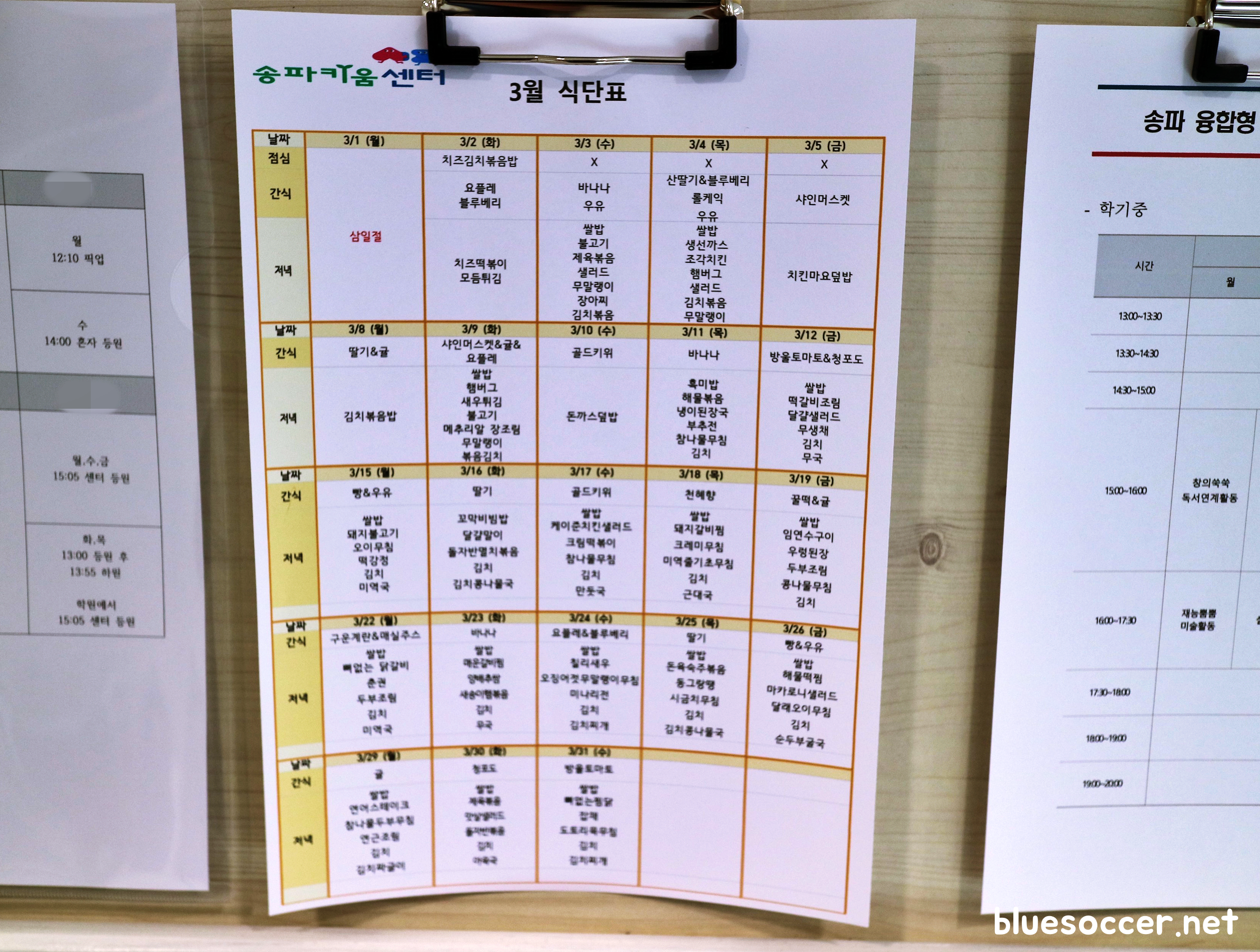 우리동네 키움센터 송파 15호점 같은 경우 융합형이라는 단어가 강조됐습니다. 아동 관련 프로그램을 운영하는 기존의 일반형 키움센터 기능 뿐만 아니라 급식 제공되는 등 기능이 다양화됐습니다. 급식 같은 경우 식단표를 찾아보니 새학기 이후로 간식 및 저녁 식사가 제공됩니다. 알고보니 융합형 키움센터는 일반형 키움센터보다 규모가 더 넓다고 합니다. 이곳의 정원은 오금동에 있는 송파11호점(융합형)과 더불어 45명인데 다른 송파구 시설에 비해 정원이 많습니다. 아동들이 활기찬 시간을 보낼 수 있는 공간 규모가 잘 확보되었다고 볼 수 있습니다.