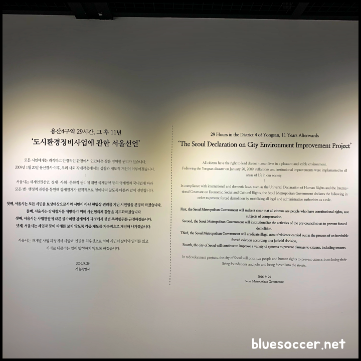 전시관에서는 2016년 9월 29일 용산 4구역 29시간, 그 후 11년 '도시환경정비사업에 관한 서울선언'이 소개됐습니다. 선언 내용은 이렇습니다.