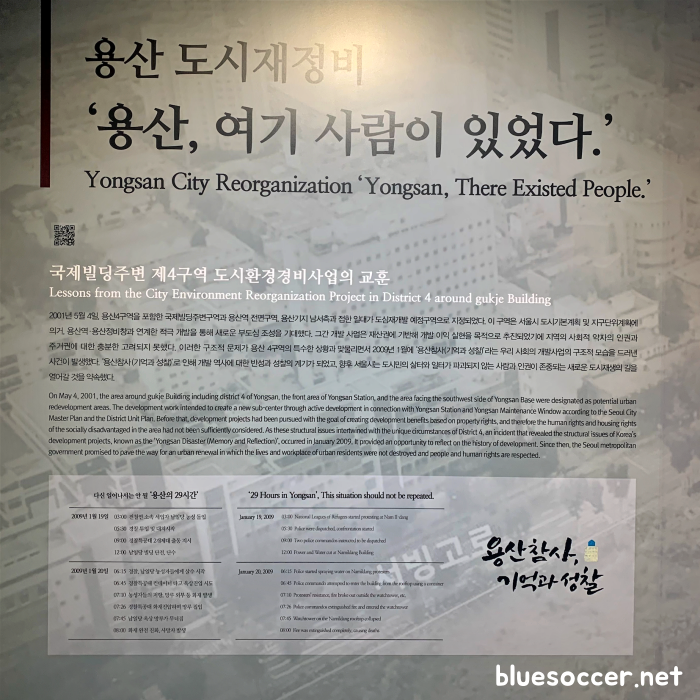 2009년 용산참사(기억과 성찰) 기억관은 서울시 도시 재개발 재정비의 역사를 반성하고 성찰하기 위한 곳이라고 합니다. 이곳에 마련된 전시물들은 용산참사를 기억하기 위해서라고 합니다.