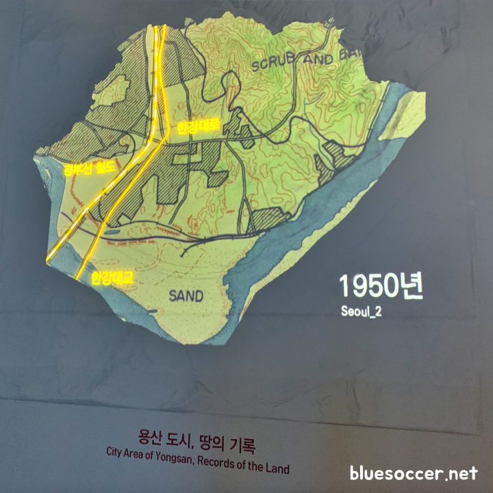 '용산 도시, 땅의 기록'이라는 전시물에 대해서는 용산 지형 모형 위에 용산의 시대별 지도가 맵핑 영상 형태로 나왔습니다. 1914년 제작된 경성부시가강계도, 1927년 용산시가도, 1939년 최신대경성전도, 1940년 서울특별시가도, 1946년 Seoul Map, 1948년 항공사진, 1948년 CITY PLAN OF SEOUL, 1950년 SEUOL MAP, 1950년 SEUOL_전쟁 피해지역, 1953년 서울도시계획가로망도, 1968년 새서울도로지번개량지구약도, 1970년 새서울약도, 1980년 항공사진에서 나타난 용산 모습을 볼 수 있습니다.