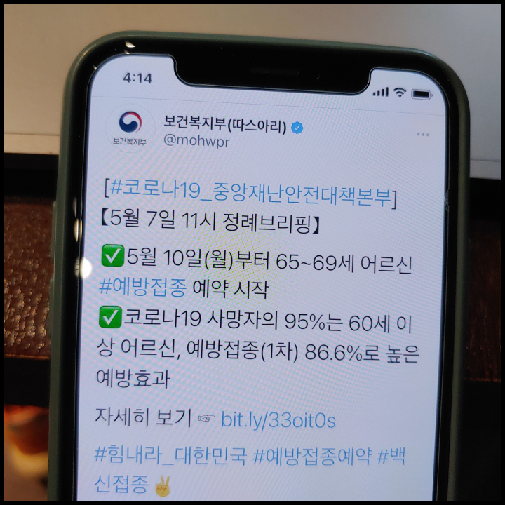 [사진 = 보건복지부 공식 트위터에서는 5월 10일 월요일 부터 65~69세 어르신 예방접종 예약 시작 되었음을 알렸습니다. 그와 더불어 코로나19 사망자의 95%는 60세 이상 어르신이라고 언급하면서 예방접종(1차)을 받는 경우 86.6%의 예방효과가 있었음을 알렸습니다. 이러한 보건복지부 공식적인 언급을 통해서 연령대 높은 어르신 분들의 백신 접종이 60세 이전 연령대에 비해서 빠른 이유를 알 수 있습니다. (C) 보건복지부 공식 트위터]