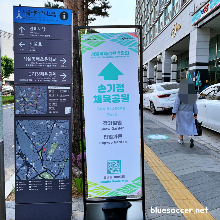 손기정 체육공원으로 향할 때 거리에 안내판이 이렇게 비치됐습니다. 스마트폰에 있는 모바일 가이드맵과 함께 하면서 길을 걷다보니 목적지를 쉽게 찾을 수 있었습니다. 손기정 체육공원 입구에 도착하니 아름다운 꽃 풍경을 볼 수 있을 뿐만 아니라 코로나19 확산 방지를 위한 방역 수칙이 안내됐습니다.
