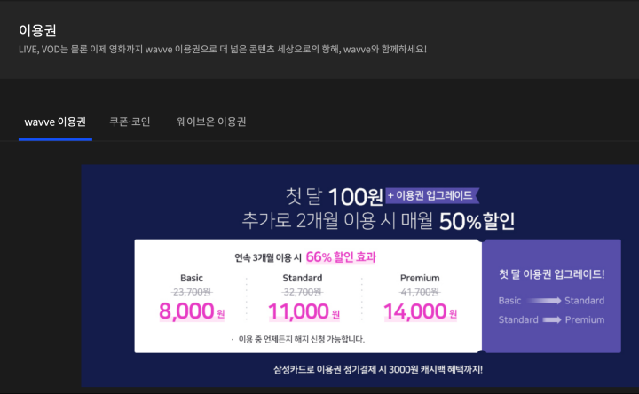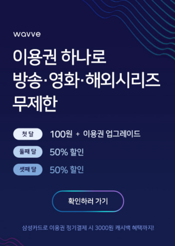 여기서 다시 살펴보면 이렇습니다. 웨이브 이용권 첫 달 100원 + 이용권 업그레이드, 둘째 달과 셋째 달에는 50% 할인이라고 나옵니다. 더욱이 웨이브 삼성카드 이용권 정기결제 시 3,000원 캐시백 혜택까지 제공된다고 합니다. 만약 해당 카드 이용하시는 분이라면 생활비 절약에 있어서 소정의 도움을 얻을 것으로 보입니다.