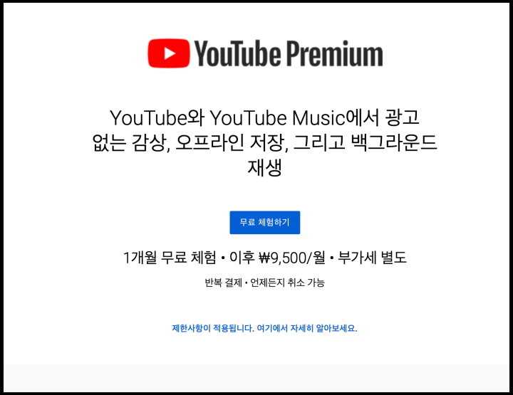 [사진 = PC에서는 유튜브 프리미엄 가격 1개월 무료 체험 이후 월 9,500원 및 부가세 별도로 나옵니다. 저의 맥북에서 이렇게 나타납니다. 만약 아이폰 쓰시는 분이라면 맥북 유튜브 프리미엄 가입 여부를 고민할지 모를 일입니다. (C) 유튜브 홈페이지]