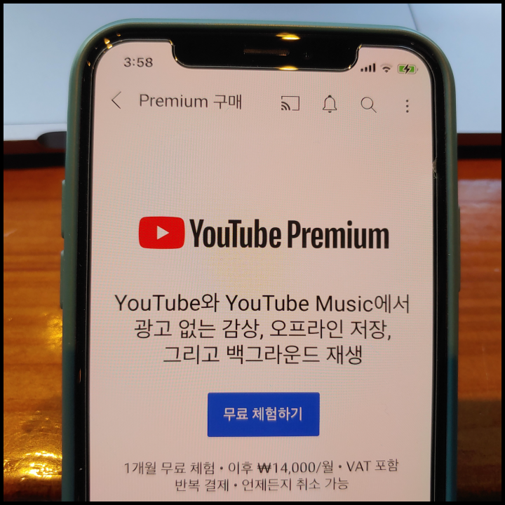 [사진 = 아이폰 유튜브 프리미엄 가격 1개월 무료 체험 이후 월 14,000원이며 VAT 포함으로 나옵니다. (C) 유튜브 앱]