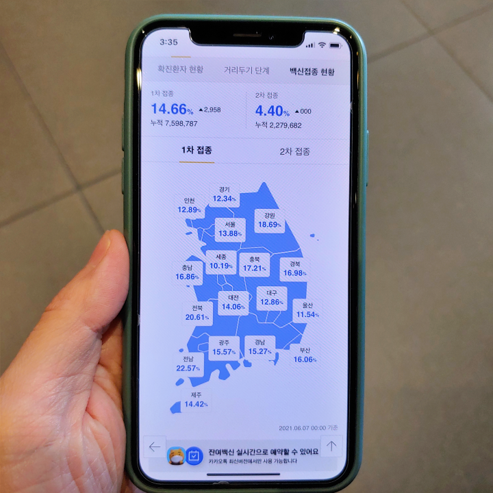 [사진 = 6월 7일 오전 0시 기준으로 한국의 백신 접종 현황 1차 14.66%, 2차 4.40% 입니다. 1차 기준으로는 전남과 전북이 20% 넘은 것이 눈에 띄며 그 다음으로는 강원도가 높습니다. (C) 다음 앱]