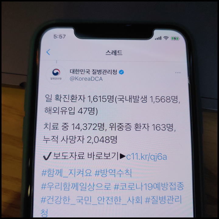 [사진 = 아울러 대한민국 질병관리청은 공식 트위터를 통해 7월 14일 오전 0시 기준 백신 누적 접종자 약 1,572만 명(1차) 약 605만 명(총 접종 완료)임을 알렸습니다. 하루 진단검사는 약 13만 1천 명, 하루 확진자 1,615명이라고 언급했습니다. (C) 대한민국 질병관리청 공식 트위터]