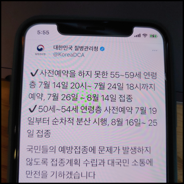 [사진 = 대한민국 질병관리청 공식 트위터에서는 55~59세 백신 접종 예약 관련된 게시물을 올렸습니다. 7월 14일 20시 재개 예정이며 앞으로는 백신 사전예약 시작 시간이 기존에는 0시였으나 이제부터는 20시(오후 8시) 부터라고 조정했습니다. 아울러 55세이상 백신 접종 신청 기존에 하셨던 분들은 7월 26일부터 8월 7일 사이에 접종 진행 예정이라고 합니다. (C) 대한민국 질병관리청 공식 트위터]