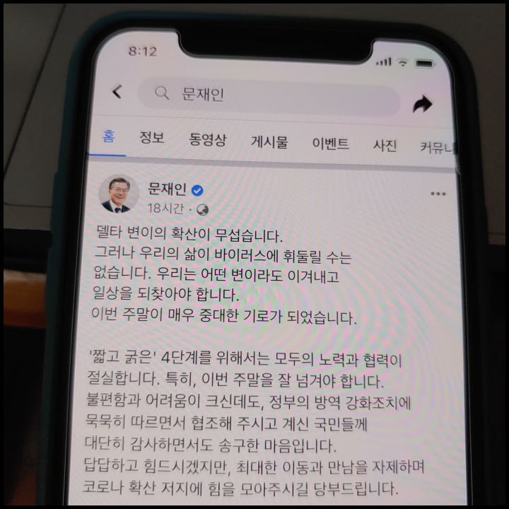 [사진 = 문재인 대통령은 공식 페이스북을 통해 델타 변이 확산을 언급하며 사회적 거리두기 4단계가 짧고 굵게 끝나려면 모두의 노력과 협력이 절실하다고 언급했습니다. 의료진과 방역 현장에서 수고하시는 분들의 헌신과 노고에 깊은 위로와 감사의 마음을 전하면서 정부는 백신 접종 속도를 높일 것이라고 전했습니다. 일상회복 시간 앞디는데 모두가 힘을 모아야 한다고 밝혔습니다. (C) 문재인 대통령 공식 페이스북]