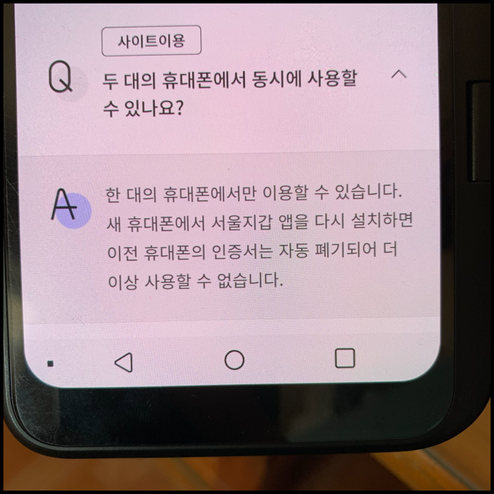 Q&A를 보니 디지털 서울지갑 앱은 휴대폰 한 대에서만 활용할 수 있다고 합니다. 새로운 스마트폰에서 해당 앱을 다시 설치하게 된다면 이전 스마트폰 인증서는 자동 폐기 및 사용 불가라는 점 참고하시기 바랍니다.