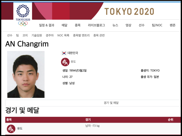 [사진 = 안창림 (An Changrim, アン·チャンリム) 국적 한국이나 출생은 일본입니다. 재일교포 3세이며 도쿄 올림픽 경기가 펼쳐지는 중인 일본 도쿄의 부도칸(무도관)에서 예전에 전국대회 우승했던 적이 있습니다. 그 대회가 쓰쿠바대학교 시절이었던 2013년 전일본학생선수권대회 우승입니다. 그런데 그 이후에 한국의 용인대학교로 편입했습니다. 이제는 한국 국가대표로 활동하면서 안창림 국적 한국이 됐습니다. (C) 도쿄 올림픽 공식 홈페이지 프로필 사진]