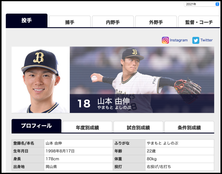 [사진 = 오릭스 버팔로스 소속의 야마모토 요시노부(山本 由伸) 오카야마현 출신이며 2016년 드래프트 4라운드 지명을 통해 현 소속팀 입단하여 2017시즌부터 활약중입니다. 2021시즌 현재 프로 입단 이후 최고의 경기력을 과시하는 중입니다. (C) 오릭스 버팔로스 공식 홈페이지 프로필 사진(buffaloes.co.jp)]