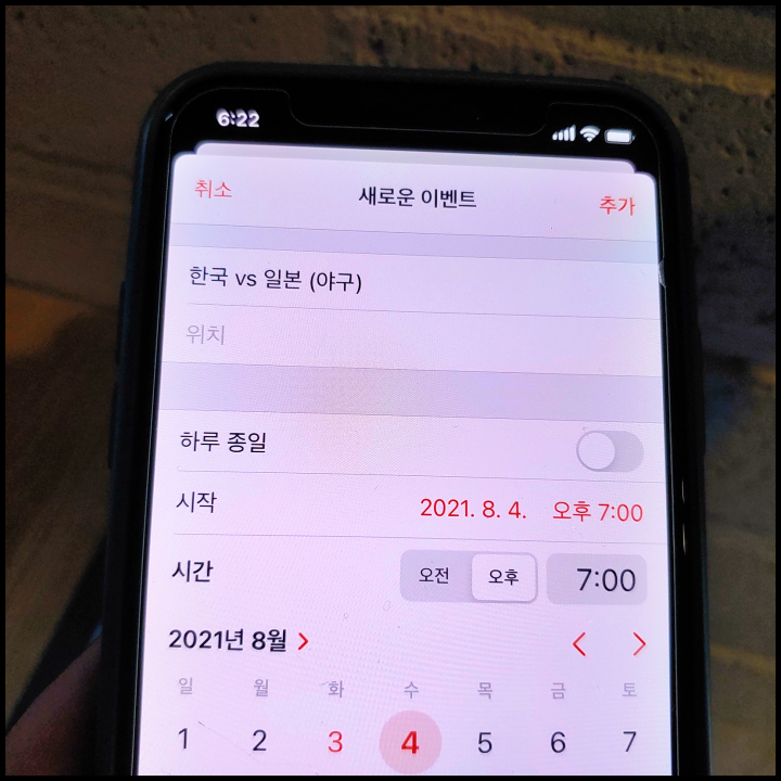 [사진 = 2021년 8월 4일 도쿄올림픽 한국 일본 야구 맞대결 펼쳐질 예정입니다. 사진은 저의 스마트폰 달력이며 2021년 8월 4일을 가리킵니다. (C) 나이스블루]