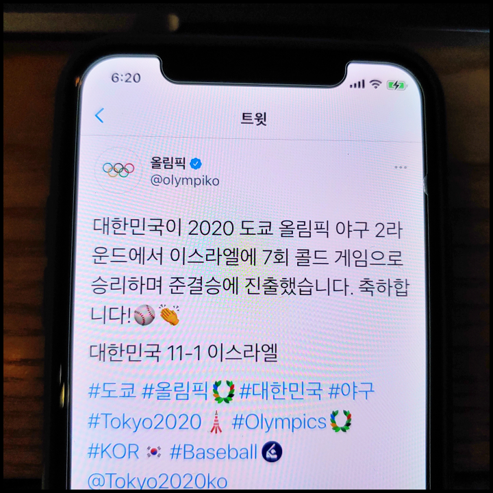 [사진 = 한국 야구 대표팀은 가장 최근 경기였던 2라운드 이스라엘전에서 11-1 7회 콜드게임 승리를 했습니다. (C) 올림픽 공식 트위터(한국어 계정)]