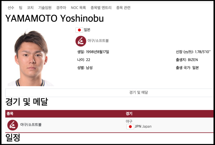 [사진 = 일본 프로야구 오릭스 버팔로스 소속의 야마모토 요시노부 프로필 및 나이 살펴보면 젊다는 것을 알 수 있습니다. 흥미롭게도 한국 야구의 기대주 이정후(키움 히어로즈)와 1998년생 동갑입니다. 이정후가 이번 일본전에서 상위 타선으로 나설 가능성이 높기 때문에 일본 선발 투수와 맞붙을 기회가 하위 타선에 비해 한 번 더 있을지 모릅니다. 현재 한국 여론에서는 일본 선발 투수 예상 인물을 야마모토 요시노부로 꼽고 있습니다. (C) 도쿄올림픽 공식 홈페이지 프로필 사진(olympics.com/tokyo-2020/ko)]