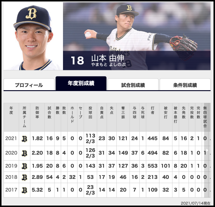 [사진 = 야마모토 요시노부 시즌별 활약상 이렇습니다. 2017시즌 신인 시절에는 1군 경험이 없었으나 2018시즌 중간 계투로서 32홀드 기록하면서 두각을 나타내기 시작했습니다. 그러더니 2019시즌부터 선발 투수로 완전히 굳히면서 끝없는 성장세를 이어가는 중입니다. (C) 오릭스 버팔로스 공식 홈페이지 프로필 사진(buffaloes.co.jp)]