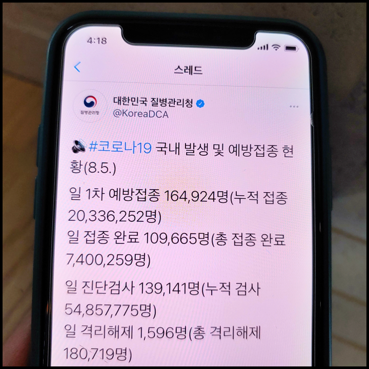 서울의 8월 5일 오전 0시 기준 신규 확진자는 466명이라고 합니다. 사진은 저의 스마트폰입니다.