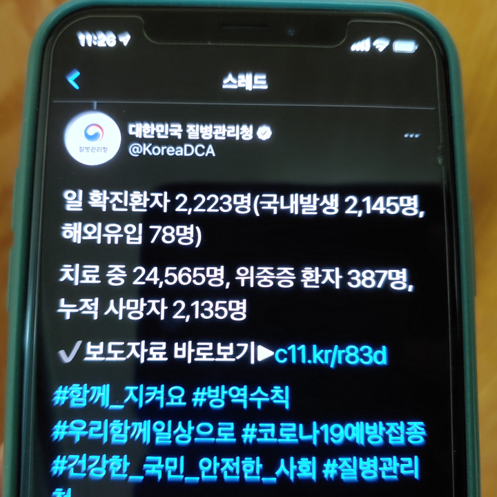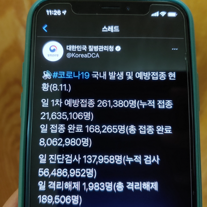 [사진 = 대한민국 질병관리청 공식 트위터에서는 8월 11일 오전 0시 기준으로 백신 접종 일 1차 누적 접종 약 2,163만 명이며 누적 접종 약 806만 명이라고 밝혔습니다. 하루 확진자는 2,223명이며 그 중에 국내발생 2,145명이라고 발표했습니다. (C) 대한민국 질병관리청 공식 트위터]