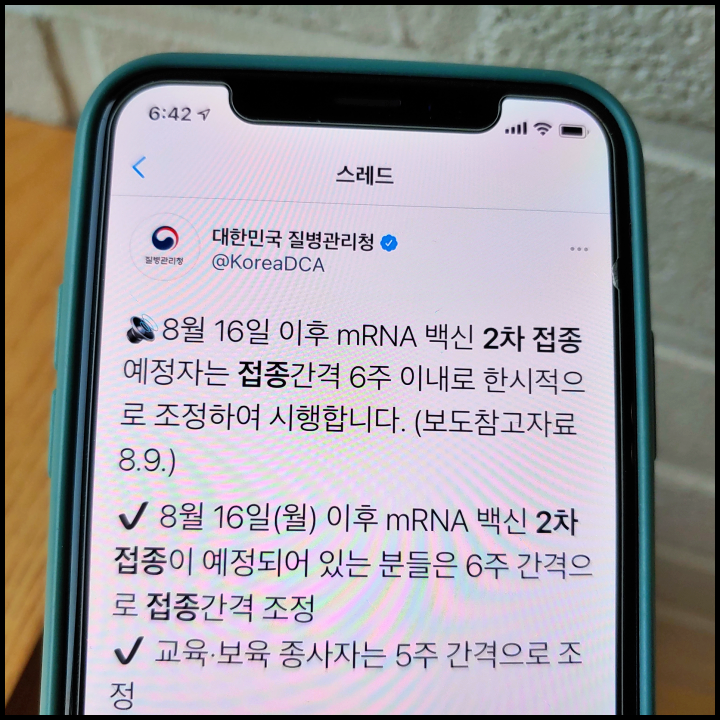 [사진 = 대한민국 질병관리청 공식 트위터에서는 mRNA 백신 2차접종 예정자 접종간격 6주 이내로 조정 시행된다고 밝혔습니다. 교육 및 보육 종사자는 5주 간격으로 조정된다고 합니다. 백신 공급상황을 고려한 결정이라고 합니다. 여기서 mRNA 백신은 화이자와 모더나 입니다. (C) 대한민국 질병관리청 공식 트위터]