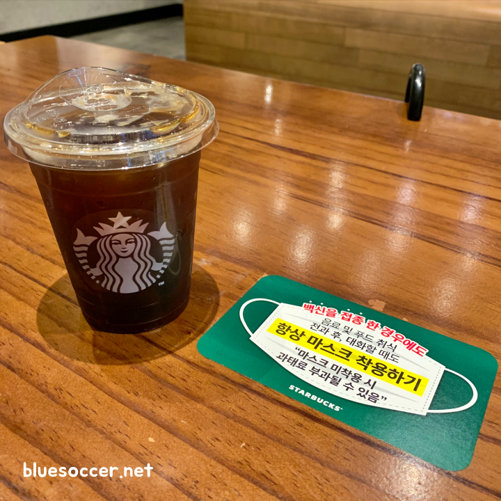 [사진 = 스타벅스에서는 백신 접종해도 항상 마스크 착용해야한다는 문구가 매장 책상에 부착됐습니다. (C) 나이스블루]