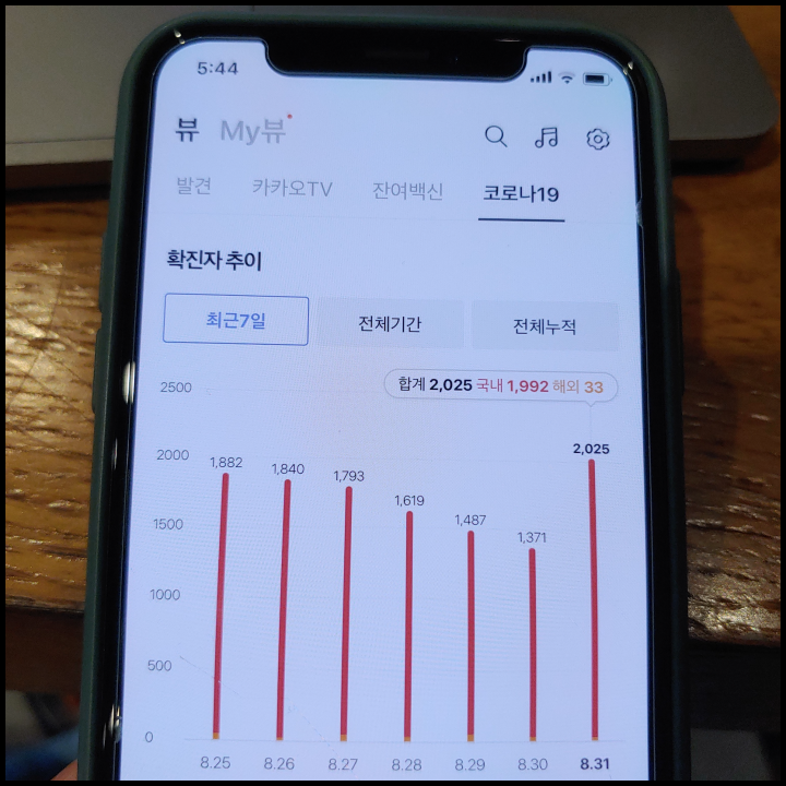[사진 = 8월 31일 하루 확진자 2,025명 나오면서 며칠 만에 다시 하루 확진자 2천 명 넘었습니다. 최근에 백신 접종했던 분들이 많았음에도 코로나19는 여전히 끝나지 않았음을 알 수 있습니다. (C) 카카오톡 앱 코로나19 섹션]