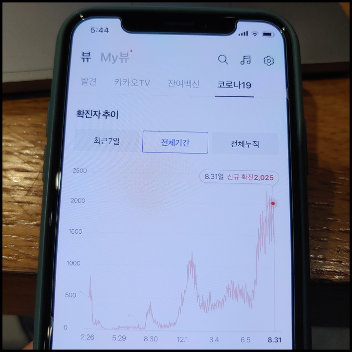 [사진 = 8월 31일 하루 확진자 2,025명 나오면서 며칠 만에 다시 하루 확진자 2천 명 넘었습니다. 최근에 백신 접종했던 분들이 많았음에도 코로나19는 여전히 끝나지 않았음을 알 수 있습니다. (C) 카카오톡 앱 코로나19 섹션]