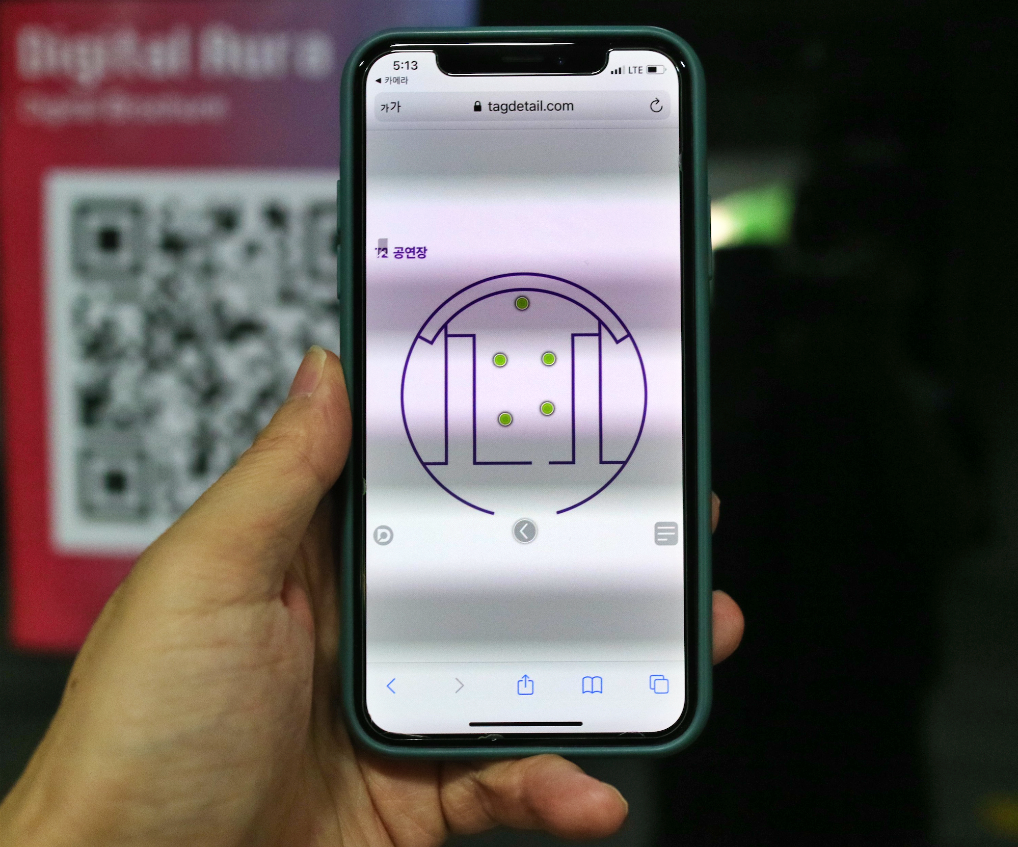 오픈미디어아트페스티벌 행사에서 특이사항 하나를 직접 경험했습니다. 작품 설명을 스마트폰으로 볼 수 있다는 점입니다. 지금까지 오프라인 전시회를 보면 작품 앞이나 또는 그 옆에 한글로 설명판이 적혀있는 모습을 볼 수 있었습니다. 그런데 이 행사에서는 설명판이 보이지 않았습니다. 코로나19 때문인지 아니면 행사 콘셉트가 미디어 아트로서 기술이 접목된 작품이 전시되었기 때문인지 몰라도 스마트폰으로 작품 설명, 작가 소개, 행사장 지도 및 작품 위치를 볼 수 있는 것이 참신했습니다. 행사장 입구에 디지털 브로셔(Digital Brochure)가 있었는데 스마트폰으로 QR 스캔을 하면 새로운 홈페이지가 뜨면서 작품 설명 포함한 행사장 정보를 쉽게 파악할 수 있었습니다.