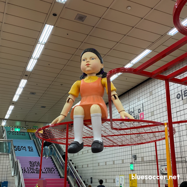 [사진 = 이태원역에 마련된 넷플릭스 오징어게임 체험존 모습 (C) 나이스블루]