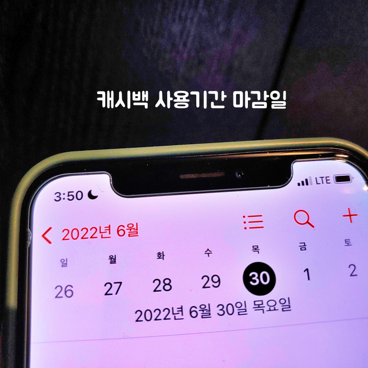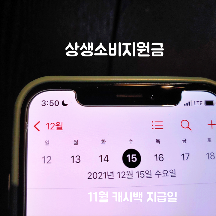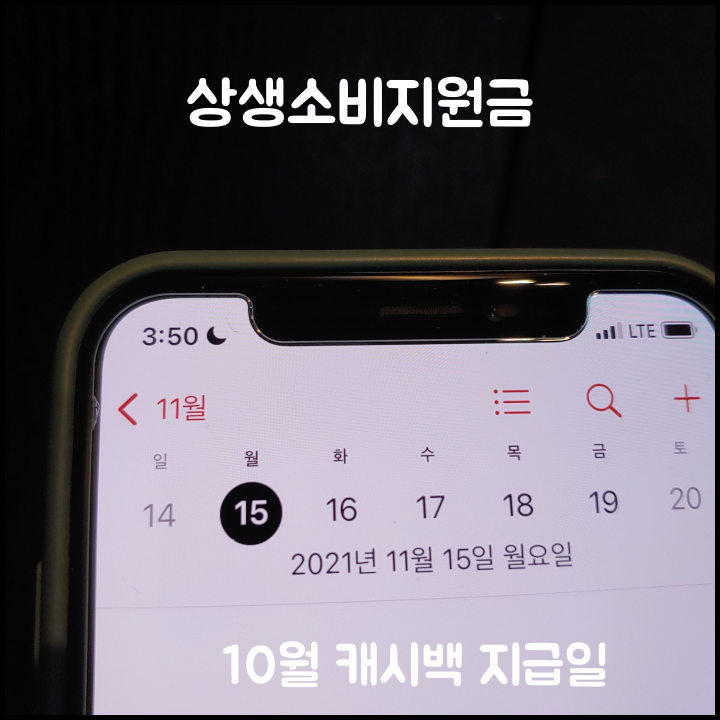 상생소비지원금 캐시백 지급 관련 정보는 이렇습니다. 10월 캐시백은 11월 15일 지급, 11월 캐시백은 12월 15일 지급, 캐시백은 2022년 6월 30일까지 사용할 수 있습니다. 사진은 저의 스마트폰 달력이며 해당일을 가리킵니다.