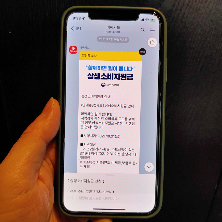 [사진 = 저 같은 경우 최근에 BC카드 카카오톡 알림톡으로부터 상생소비지원금 안내를 받았습니다. 해당 지원금은 10월 1일 금요일부터 시행되며 지원대상이 안내되어 있습니다. 비소비성 지출을 빼더라도 2분기 카드 실적이 있는 분들이 많을 겁니다. (C) BC카드 카카오톡 알림톡]