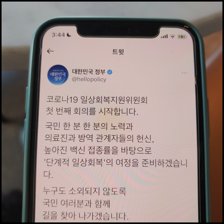 [사진 = 대한민국 정부 공식 트위터에서는 10월 13일 게시물을 통해 코로나19 일상회복지원위원회 첫 번째 회의를 시작한다고 밝혔습니다. 여기서도 단계적 일상회복 단어가 강조된 것이 눈길을 끕니다. 어쩌면 정부에서 위드 코로나 뜻 순화된 용어인 단계적 일상회복을 더 내세우는게 아닌가 싶습니다. 이 부분은 저의 개인적 생각입니다. (C) 대한민국 정부 공식 트위터]