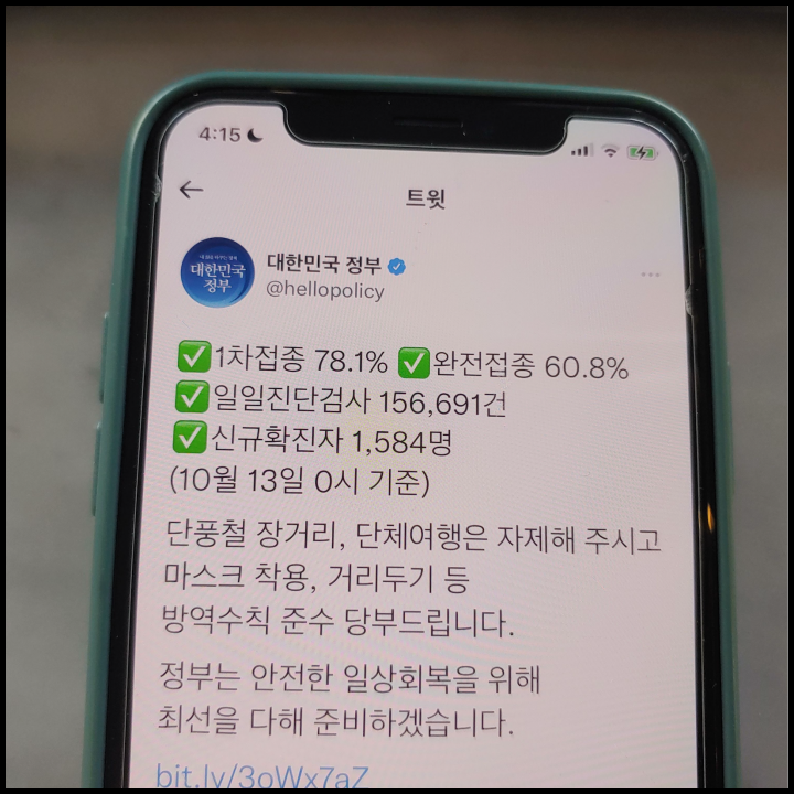 [사진 = 대한민국 정부 공식 트위터에 따르면 한국의 백신 1차 접종 78.1%, 완전 접종 60.8%, 일일진단검사 약 15만 6천여 건, 하루 확진자 1,584명이라고 밝혔습니다.(10월 13일 0시 기준) 이로써 한국의 누적 백신 1차 접종 인원은 약 4천만 명이며 누적 백신 완전 접종 인원은 약 3,100만 명입니다. 이제는 한국인 5명 중에 대략 4명은 백신 접종 경험이 있으며 그 중에 3명이 백신 완전 접종을 마쳤다고 보시면 됩니다. (C) 대한민국 정부 공식 트위터]