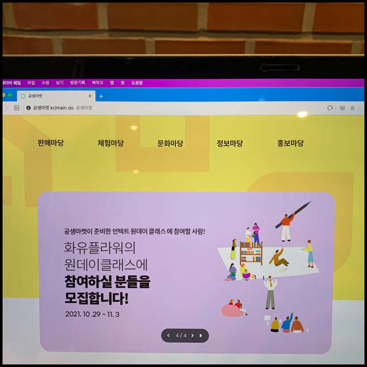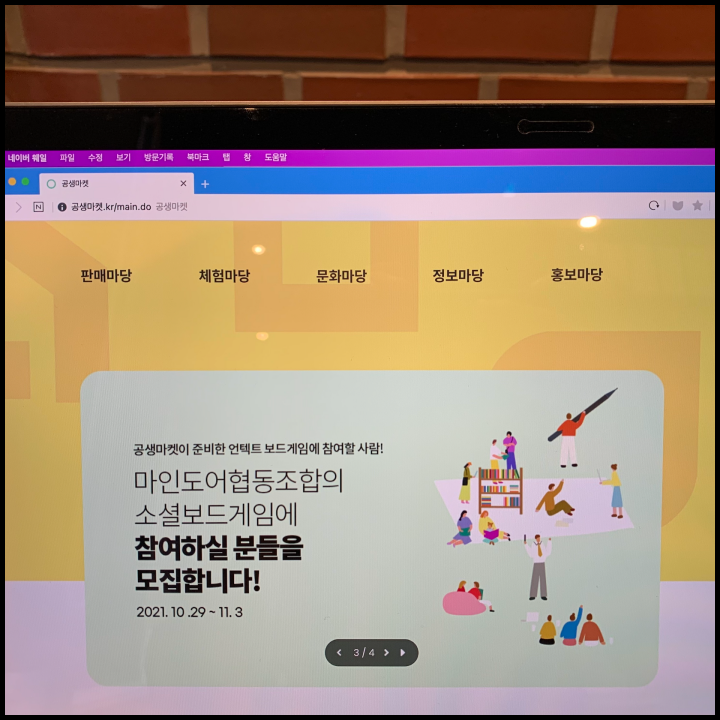 메인페이지에서는 언택트 보드게임 및 언택트 원데이 클래스 참여할 사람 모집중이었습니다.(11월 3일까지) 알고보니 공생마켓 홈페이지 메뉴 중에 체험마당이라고 있습니다. 사회적 기업이나 사회적협동조합에서 진행하는 것을 알리기도 합니다.