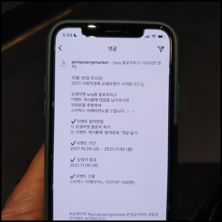 공생마켓에서는 오는 11월 8일 월요일까지 공생마켓 인스타그램 팔로우 및 이벤트 게시물 '참여완료' 댓글을 달 경우 스타벅스 아메리카노 기프티콘(100명) 증정한다고 합니다. 당첨자는 오는 11월 9일 화요일 발표한다고 합니다. 이러한 이벤트를 통해서 공생마켓이 더 많은 사람들에게 알려질 것으로 보입니다.