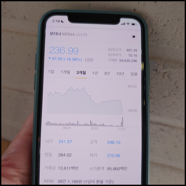 [사진 = 반면 모더나 주가 하락 두드러집니다. 11월 5일 기준으로 16.56% 하락했습니다. 1개월 및 3개월 단위로 봤을 때에도 하락세가 심합니다. 3개월 단위에서는 고점에 비해서 거의 절반 정도 빠졌습니다. (C) 다음 앱]