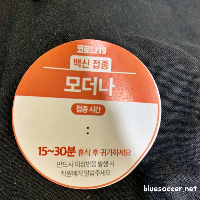 저는 모더나 부스터샷 예정이었기 때문에 이러한 스티커가 옷에 부착됐습니다. 그러고나서 몇 분 기다렸다가 해당 백신 접종했습니다.