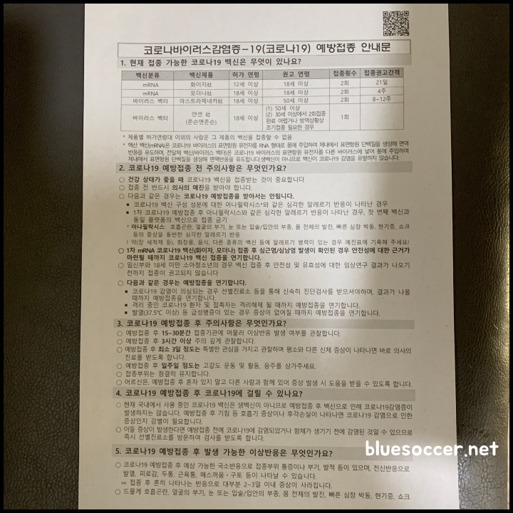 백신 접종 기관에 도착하면 예방접종 안내문을 받게 됩니다. 예방접종 전후의 주의사항이나 예방접종 후 발생 가능한 이상반응이 무엇인지 알 수 있습니다. 그중에 전신반응으로 발열, 피로감, 두통, 근육통, 매스꺼움/구토 등이 나타날 수 있다고 언급되어 있으나 접종 후 흔히 나타나는 반응으로 대부분 2~3일 이내 증상 사라진다고 안내됐습니다.