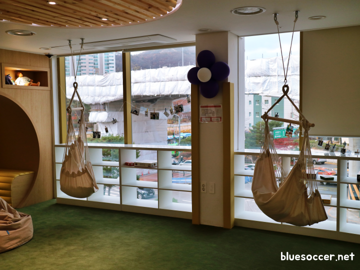 3층으로 내려오니 어린이에 친화적인 분위기가 더욱 짙었습니다. 해먹과 더불어 누워서 휴식을 취할 수 있는 공간이 마련됐습니다. 그와 더불어 다양한 놀이를 할 수 있을 것 같아 보입니다. 이곳에는 요리실, 방송크리에이터실이 있습니다. 아동이 무언가를 직접 하면서 새로운 것을 익히기 좋은 공간이라 할 수 있습니다.