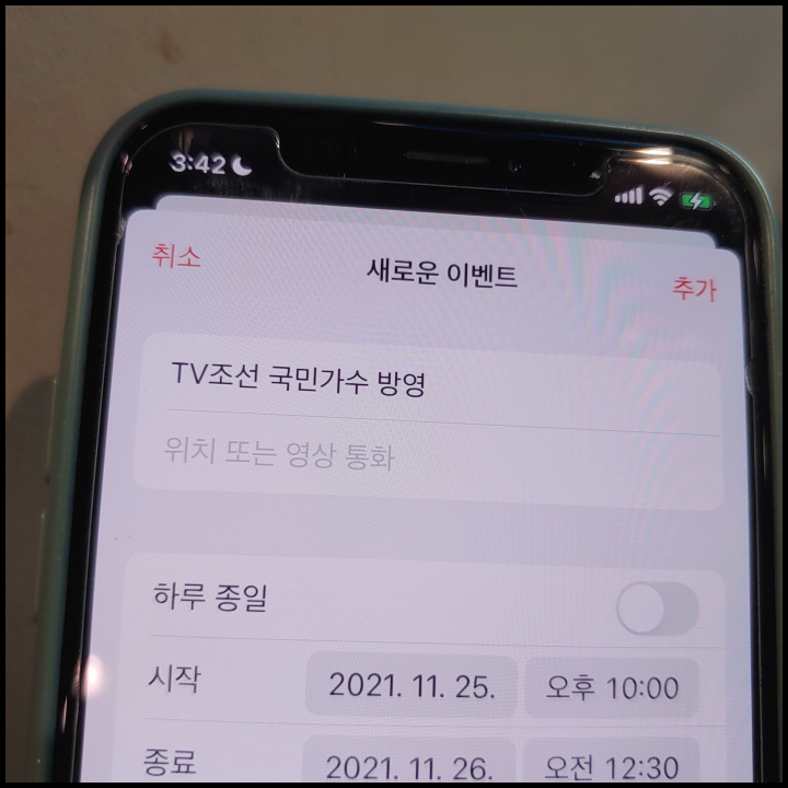 [사진 = 2021년 11월 25일 TV조선 국민가수 방영 예정입니다. 사진은 저의 스마트폰 달력이며 2021년 11월 25일을 가리킵니다. 이번 대장전에서 박장현 솔로 무대 나올 것으로 보입니다. (C) 나이스블루]