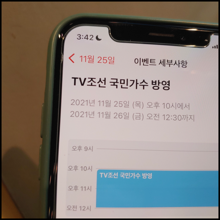 [사진 = 2021년 11월 25일 TV조선 국민가수 방영 예정입니다. 사진은 저의 스마트폰 달력이며 2021년 11월 25일을 가리킵니다. 이번 대장전에서 박장현 솔로 무대 나올 것으로 보입니다. (C) 나이스블루]