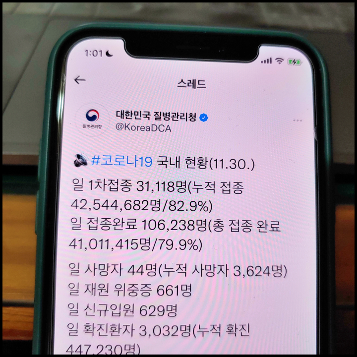 [사진 = 대한민국 질병관리청 공식 트위터에 따르면 11월 30일 오전 0시 기준으로 하루 확진자 3,092명이라고 합니다. 백신 하루 1차 접종율 82.9%, 접종 완료율 79.9%라고 합니다. (C) 대한민국 질병관리청 공식 트위터]