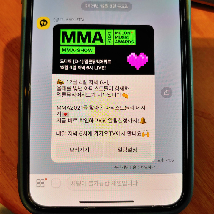 [사진 = 2021 멜론뮤직어워드 중계 오후 6시부터 시작된다고 합니다. 카카오TV에서 말입니다. 저 같은 경우에는 카카오톡 앱에 카카오TV 통해서 해당 시상식 중계에 대한 안내를 받았습니다. 아울러 멜론에서도 중계 가능하며 해외에서는 1theK 유튜브 채널에서 중계한다고 합니다. (C) 카카오톡 앱]