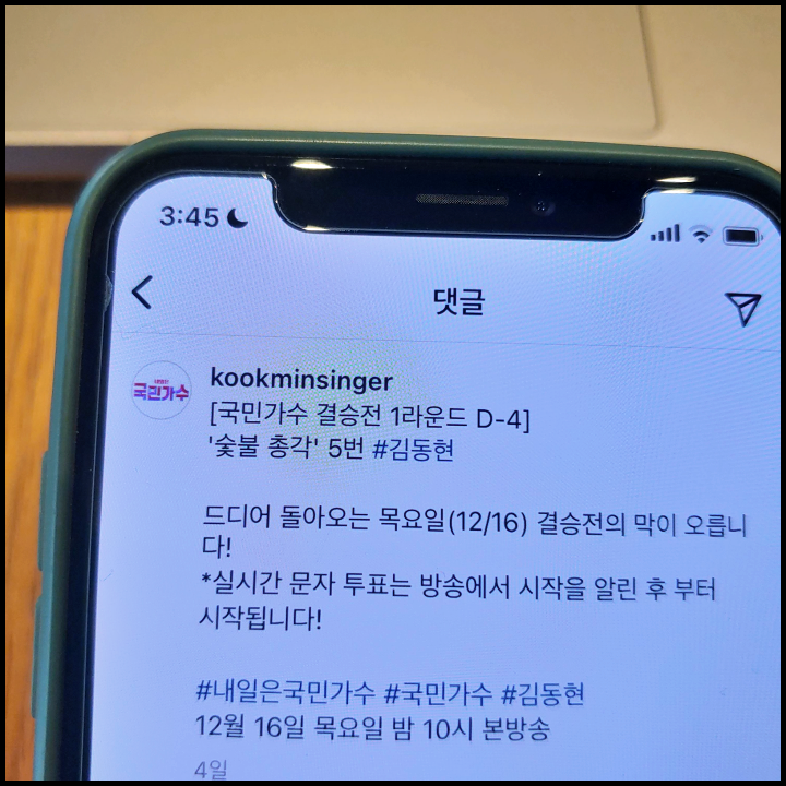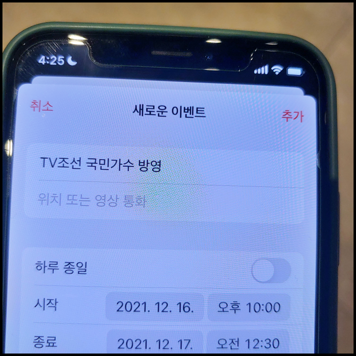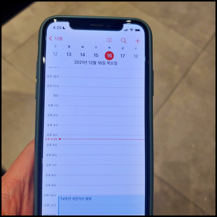 [사진 = 2021년 12월 16일 TV조선 내일은 국민가수 방영 예정입니다. 결승전 1라운드 방영 예정입니다. 사진은 저의 스마트폰 달력이며 2021년 12월 16일을 가리킵니다. (C) 나이스블루]