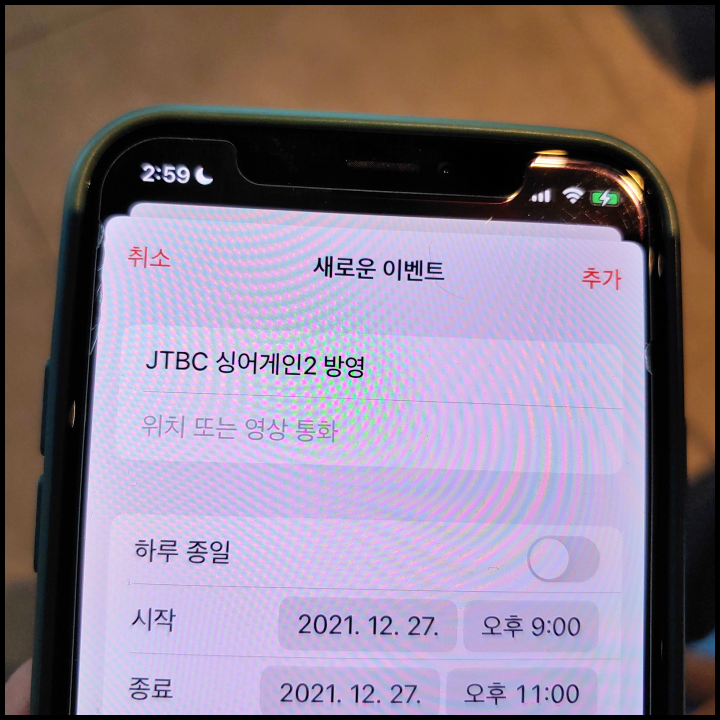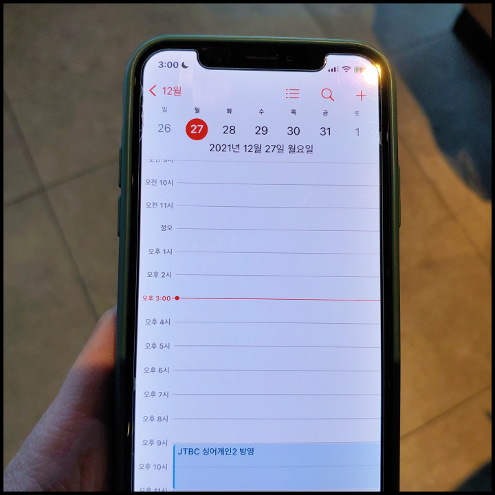 [사진 = 2021년 12월 27일 JTBC 싱어게인2 방영 예정입니다. 사진은 저의 스마트폰 달력이며 2021년 12월 27일을 가리킵니다. (C) 나이스블루]