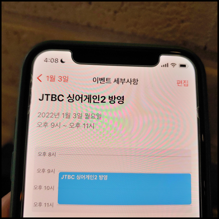 [사진 = 2022년 1월 3일 JTBC 싱어게인2 방영 예정입니다. 사진은 저의 스마트폰 달력이며 2022년 1월 3일을 가리킵니다. (C) 나이스블루]