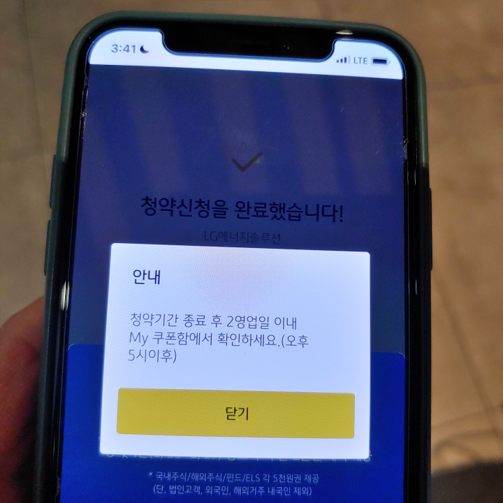 이렇게 KB증권 LG에너지솔루션 공모주 청약 완료했습니다. 저는 10주 신청했는데 균등 및 비례 배정 생각하면 너무 적게 신청한게 아닌가 싶은 생각을 해봅니다. 어쩌면 단 1주도 못받는게 아닌가 그런 생각이 드는데 일단 1주도 못받더라도 의미있는 경험했다고 생각합니다. 청약 수수료 1,500원은 후불이라고 뜹니다. 아울러 KB증권 이벤트에 의해서 금융쿠폰 2만 원 받게 됐습니다. 국내주식, 해외주식, 펀드, ELS 각 5천 원권 제공된다고 하는데 청약기간 끝난 뒤 2영업일 이내 KB증권 M-able 앱에 있는 My 쿠폰함에서 확인할 수 있다고 합니다.