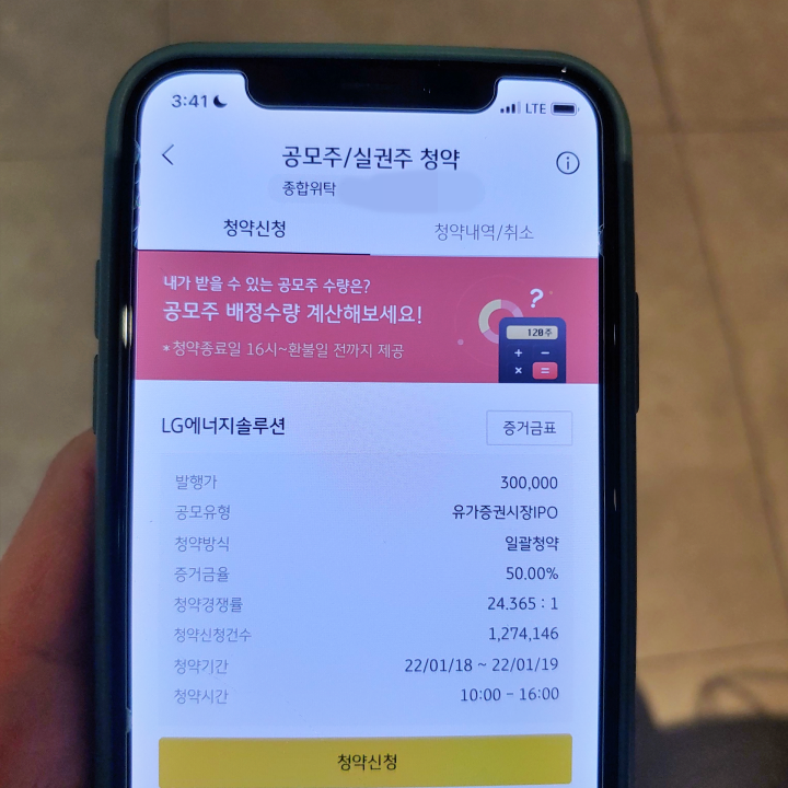 LG에너지솔루션 공모주 청약 방법 많은 분들이 알고 계실 듯 합니다. 근래 공모주 청약이 많은 인기를 끄는 중입니다. 지난해 SK아이이테크놀로지(SKIET), 카카오뱅크, 카카오페이, 지아이텍, 디어유, 알비더블유(RBW) 같은 주요 공모주들이 상장 이후 잘 나갔던 전례가 있습니다. 좋은 공모주 발굴해서 청약하면 이득을 얻을 가능성이 있다고 볼 수 있습니다. 물론 공모주 청약한다고 무조건 이득을 얻는다는 보장은 할 수 없기 때문에 이번 LG에너지솔루션 공모주 청약 너무 많은 기대감을 가지지 않으셨으면 합니다. 그것도 그거지만, 현재 많은 분들이 청약에 참여했기 때문에 1주라도 받을 수 있을지 개인적인 솔직한 심정으로는 애가 타는 기분입니다.