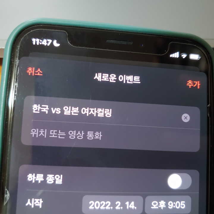 [사진 = 2022 베이징 동계 올림픽 여자컬링 조별리그 한국 일본 맞대결이 국내 시간 기준으로 2월 14일 오후 9시 5분에 펼쳐집니다. 이날 경기 중에서 가장 많은 사람들의 관심을 집중시킬 대표적인 경기가 될 것 같습니다. 숙명의 한일전이기 때문입니다. 4년 전 평창 동계 올림픽에서 라이벌 구도가 팽팽하게 흘러갔던 것처럼 이번 대회는 어떨지 주목됩니다. 사진은 저의 스마트폰 달력이며 2월 14일을 가리킵니다. (C) 나이스블루]