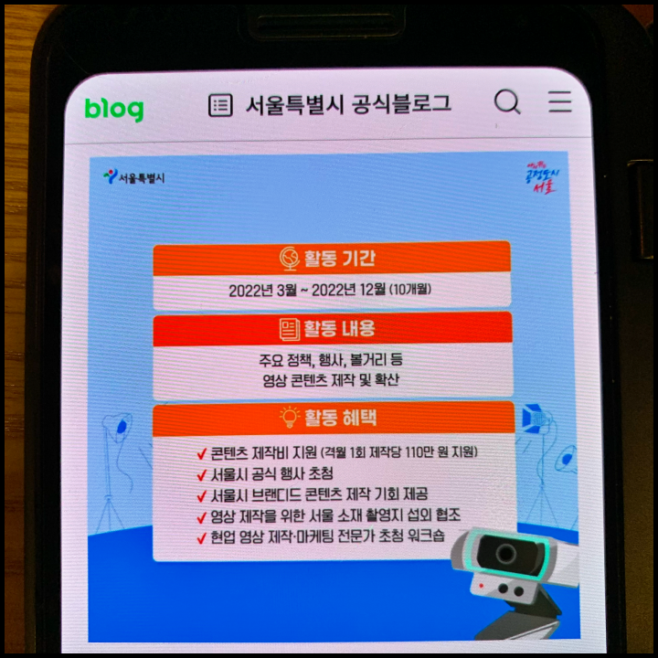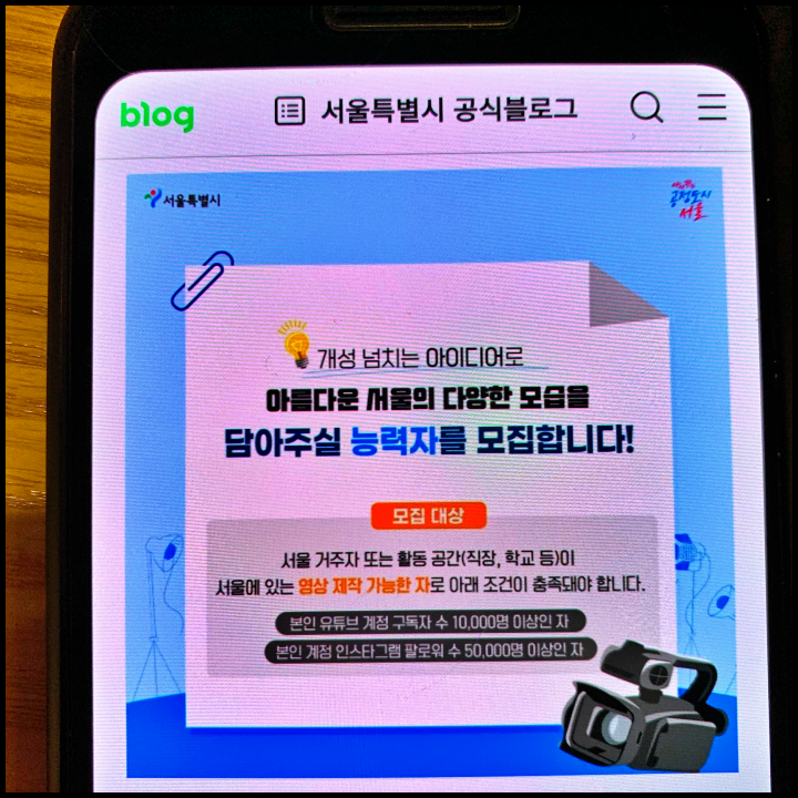 2022 서울영상크리에이터 모집 눈여겨 보는 분들이 있을 것으로 보입니다. 유튜브 구독자 및 인스타그램 팔로워가 많을 뿐만 아니라 영상 제작을 잘하는, 서울시에 거주하거나 또는 직장이나 학교 등이 서울시에 있는 분들에게 좋은 기회가 될 듯 합니다. 서울시에서 운영하는 2022 서울영상크리에이터 7기 모집 공고가 떴기 때문입니다. 영상 제작으로 서울의 매력을 많은 사람들에게 알릴 수 있을 뿐만 아니라 활동 혜택이 푸짐하기 때문에 그동안 서울영상크리에이터가 되고 싶어했던 분들이 있으셨을 겁니다. 저로서도 이번 모집을 보면서 '진작에 영상 편집을 잘해볼걸'이라는 생각이 드는데 이번 7기 크리에이터가 되려면 어떤 조건을 충족하면서 혜택을 받을 수 있는지 살펴보도록 하겠습니다.